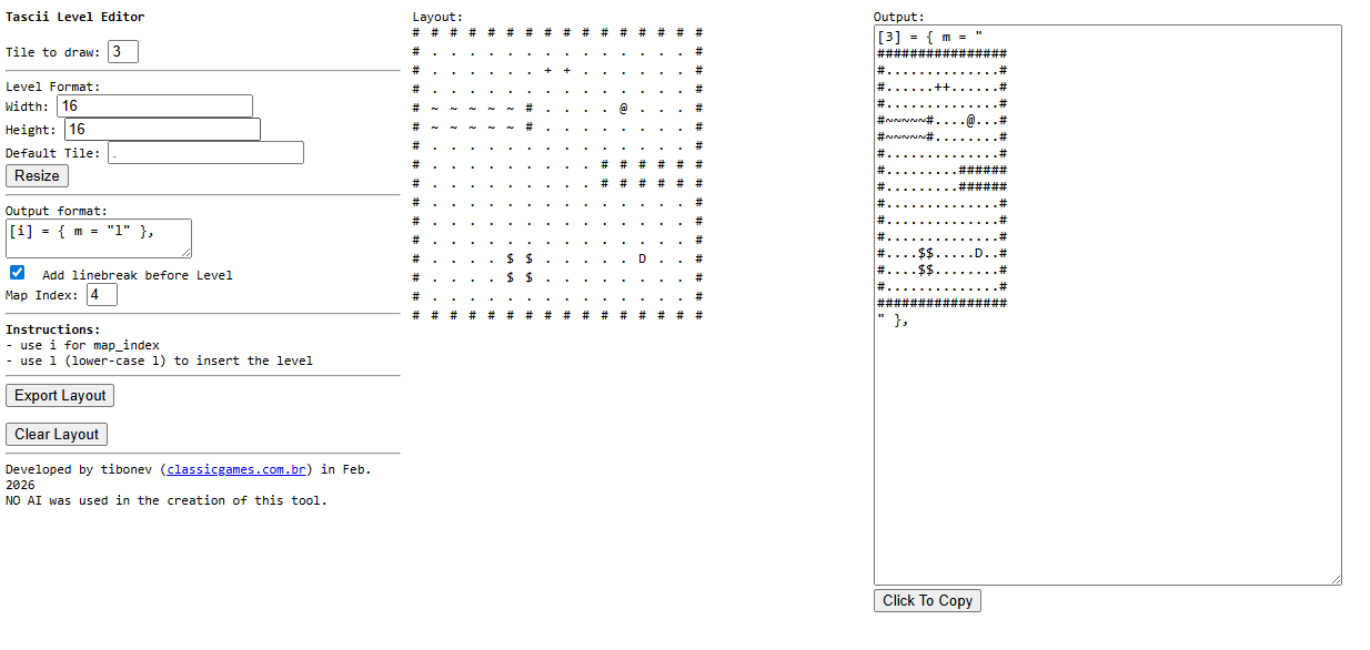 But as i started working on my levels, i noticed that none of the ASCII Level editors that i could find allowed me to copy the level inside an c-array or lua table, or similar. So i did what anyone would do, i decided to code my own level editor to use on this mini-game. It is very simple, specially on the interface, because the idea is to use to quickly design levels and export it to my game. You can drag the mouse to paint characters, and you can just press a key to change the "current tile" (aka the character) you're putting on the grid. All very quick and simple. But it works. Now i can focus on what is important, making the levels and finishing this game, hopefully on the next week or two.